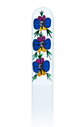 Blue Pansy design, handpainted, with elegant touches of pink and yellow, and finished with