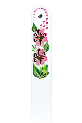 Pink flower design in 90mm sizing, with two preciosa stones, and green foliage.